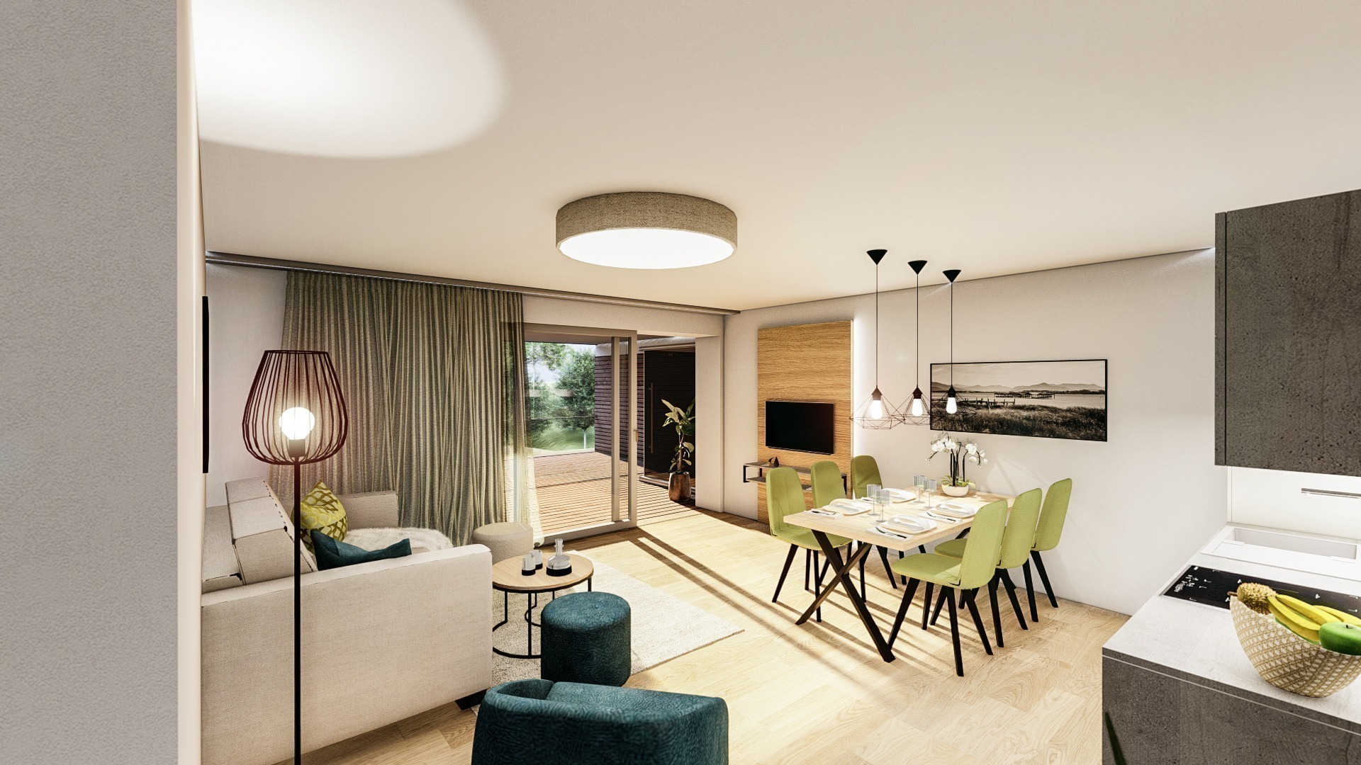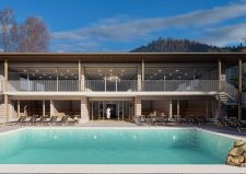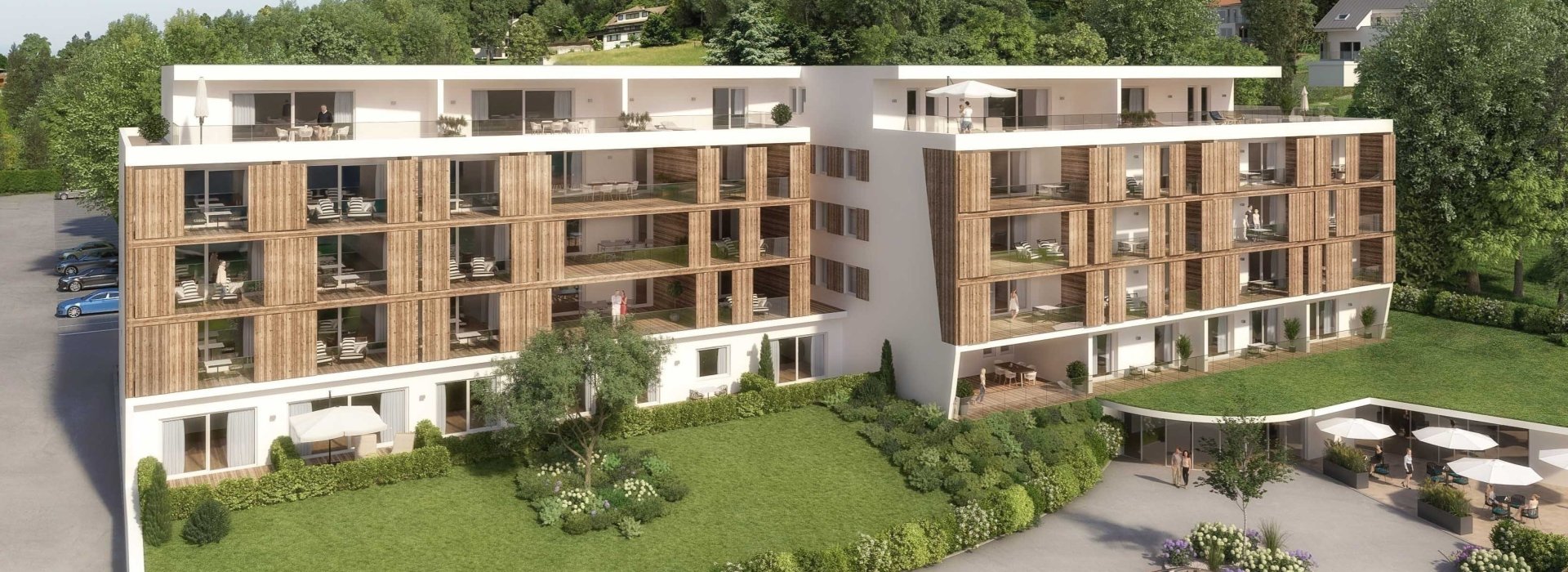 The new Lakeside Resort Klopeiner See features 41 apartments with spacious loggias, balconies, or terraces. The building houses a reception, a cafe, and a bar.