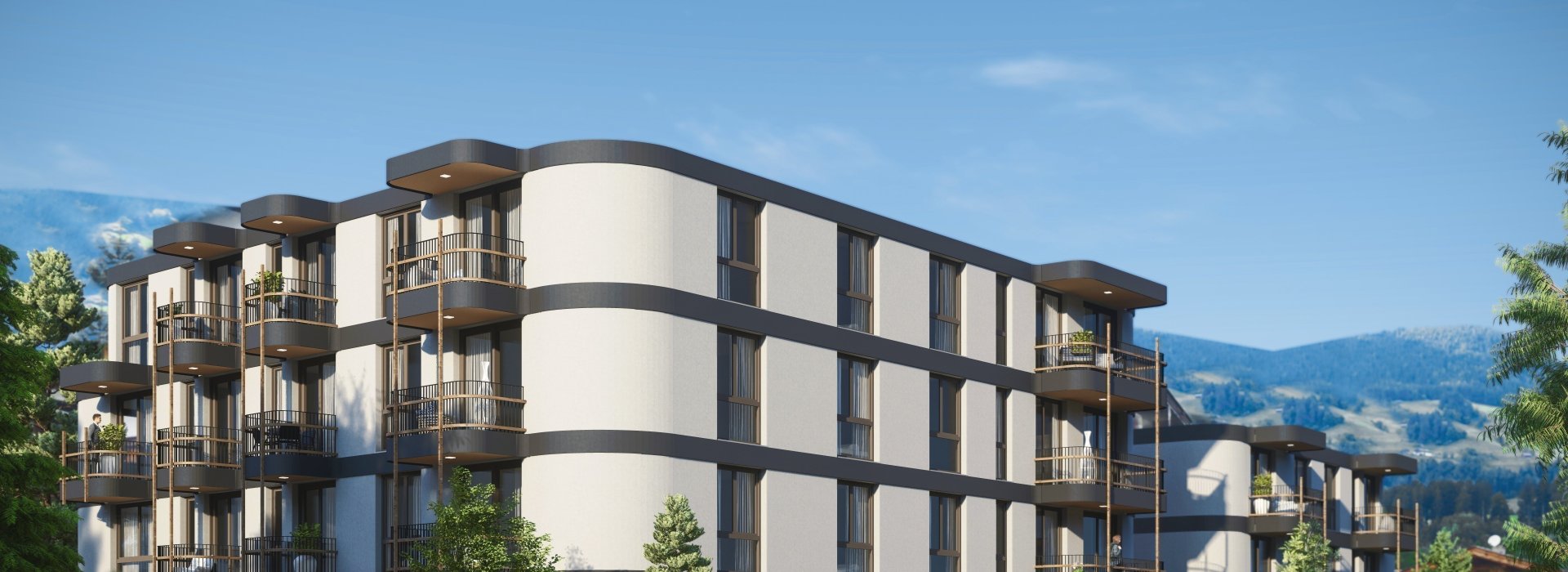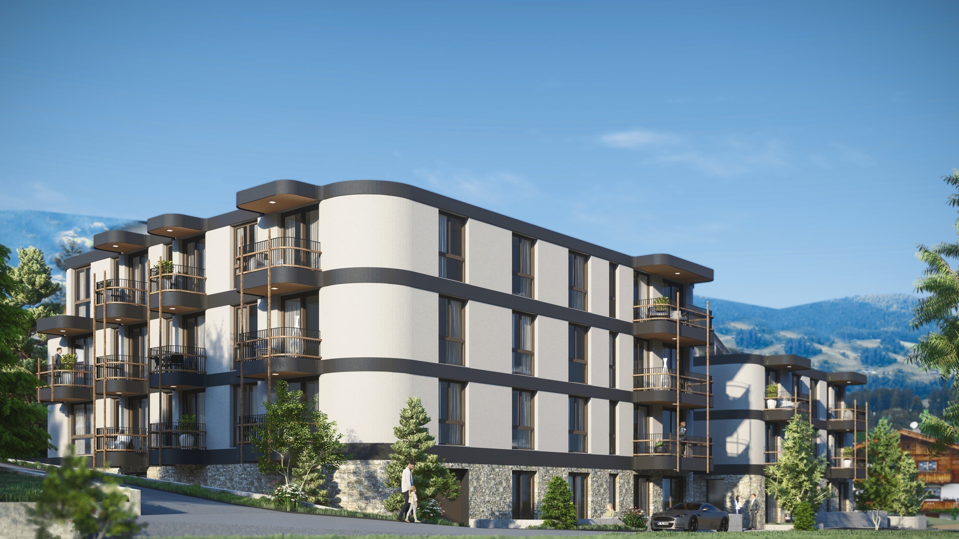 The apartment building is designed in a modern style, with elements of Tyrolean architecture, perfection being emphasized in every detail.