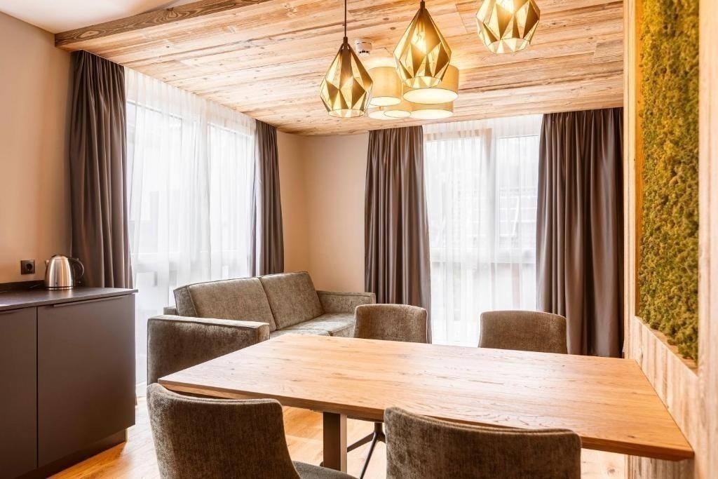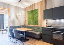 The apartments are decorated in an alpine spirit - from custom-made furniture to walls made of real moss and wallpapers with symmetrical ornaments.