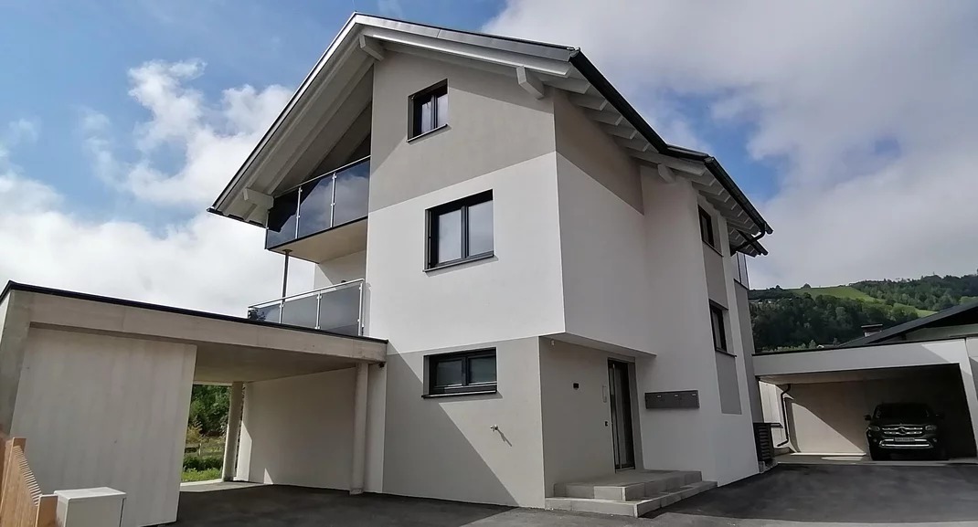The three-apartment house was built in 2021 on the western edge of Schladming, approximately 1.3 kilometres from the town centre and 600 metres from the Planai West and Rohrmoos I cable car stations.