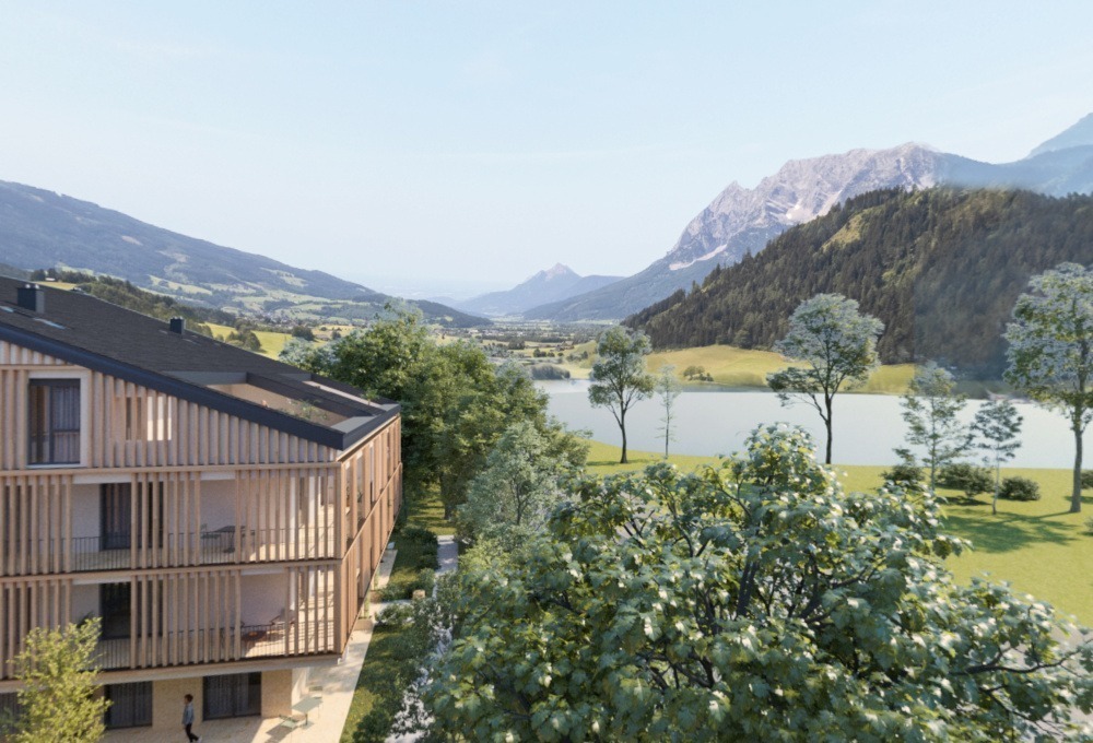 This new project with six modern buildings with holiday apartments for permanent living or unlimited time use will be developed at a beautiful site directly by the Putterer lake with views of the surrounding Grimming and Stoderzinken mountains.