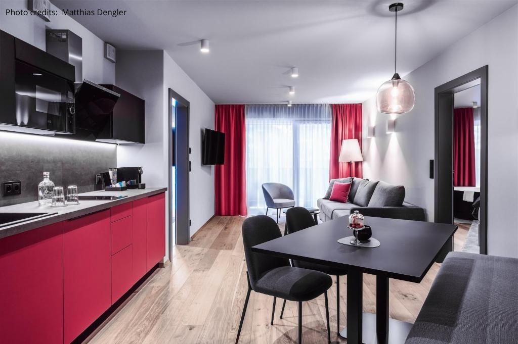 The complex impresses not only with the quality of the accommodation, but also with its culinary diversity. In the restaurant LA'LIV (86 seats including terrace) guests can enjoy refined Austrian and French cuisine. For convivial social evenings, the Sky Bar The Vue offers a magnificent panoramic view and a range of signature cocktails.